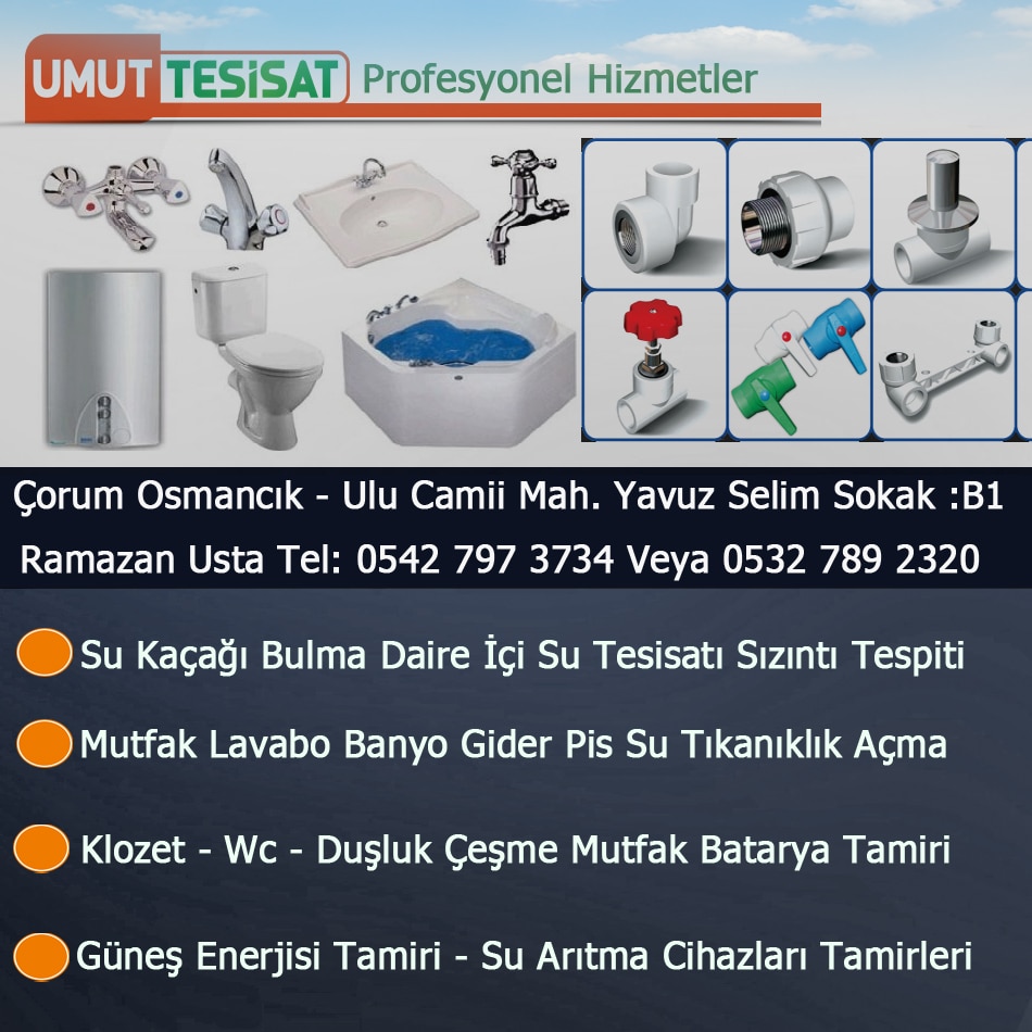 Kullanılan profesyonel su kaçağı tespit yöntemleri sayesinde kalıcı çözümler üretilmekte ve aynı durumun tekrar yaşanması riski ortadan kaldırılmaktadır. Firmamız kombiservisiosmancik.com olarak yaşamış olduğunuz tüm sorunlara uzman ekibi ile beraber en hızlı çözümleri üretmeye devam etmektedir. Bize telefon numaralarımızdan ve web sitemiz üzerinden haftanın her günü 7/24 ulaşım sağlayabilirsiniz. Çorum Osmancık Su Tesisatçısı,ç servis,